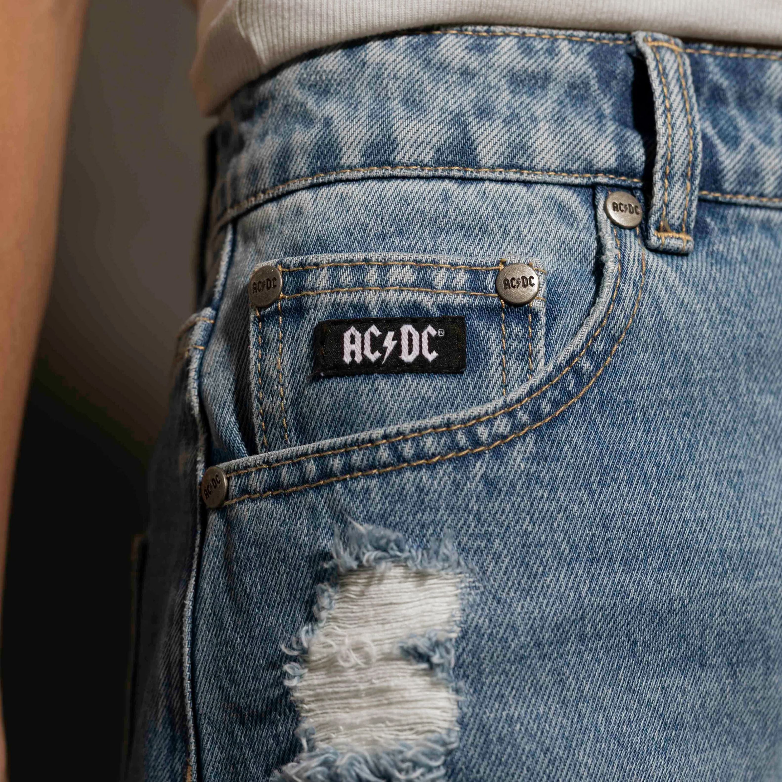 - AC/DC print across the back pockets and centre seam — a standout detail from every angle