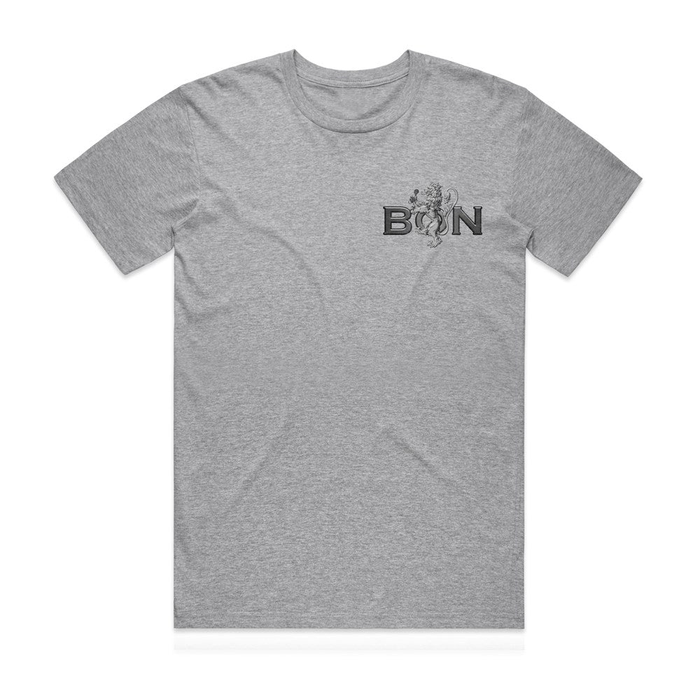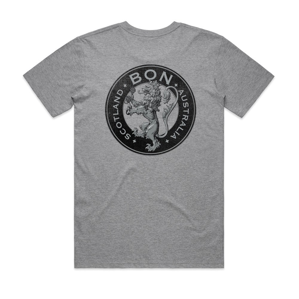 This Bon Scott shirt features the "Bon" wording on the front and the Bon Australia/Scotland Crest logo on the back. Let there be rock!