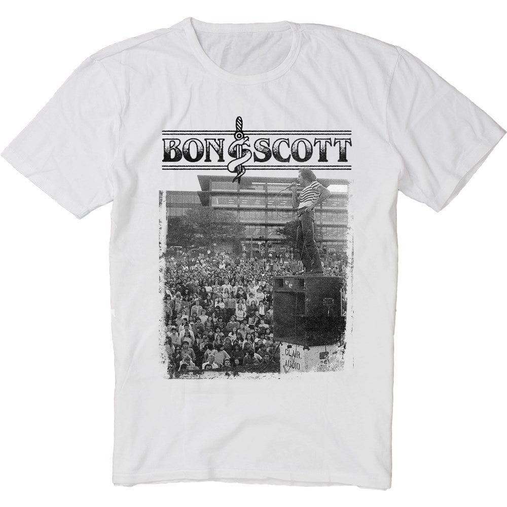 This Bon Scott shirt features a photo from AC/DC's legendary gig in 1975 at Victoria Park, Sydney, NSW. Bon Scott standing proud on a speaker box.