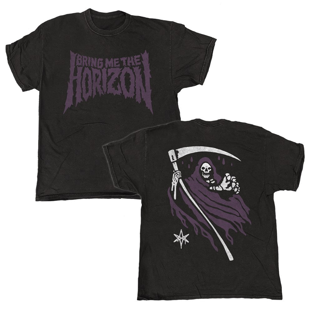 Introducing our "Reaper Cartoon" Vintage Wash Black T-shirt by Bring Me The Horizon. This tee features a captivating purple print of the band name on the front, adding a pop of color to the vintage wash fabric. On the back, an image of a grim reaper with a sickle and outstretched hand creates a striking visual, embodying the band's dark aesthetic.
