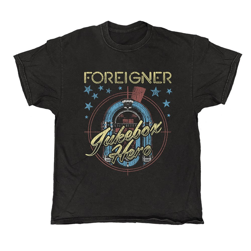 Unleash your inner jukebox hero with Foreigner's black vintage t-shirt.