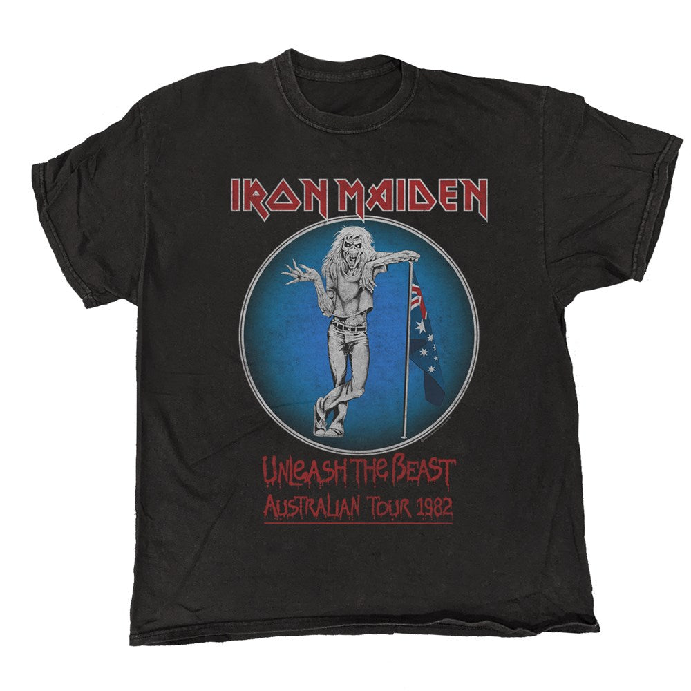 This Iron Maiden t-shirt has the design from the 'Unleash The Beast' Australian tour from 1982. On a vintage wash.