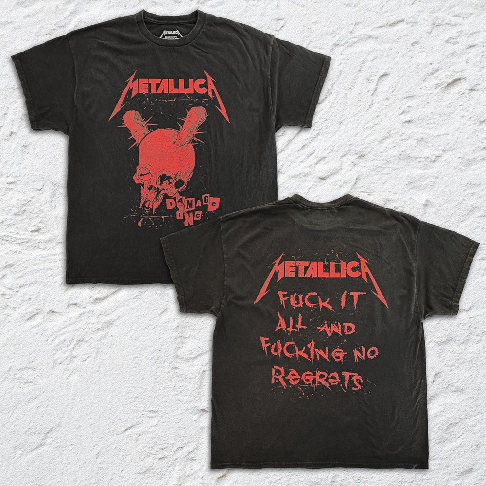 Bring attitude and edge to your wardrobe with the Metallica F’ing No Regrets Black Vintage T-shirt. Featuring bold, rebellious artwork on a black vintage wash, this tee captures the raw energy and unapologetic spirit that Metallica is known for. Its worn-in style gives it instant streetwear appeal, making it a staple for concerts, everyday wear, or adding to your growing collection of band merch.