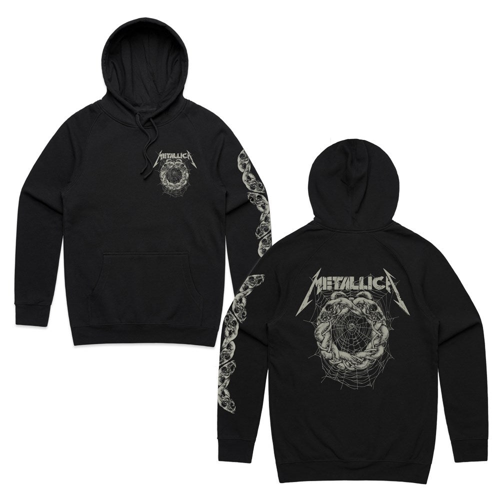This Metallica hoodie has a brutal snake in a ring over a spider web on the front. With a snake ring chain on the sleeve of the hoodie.