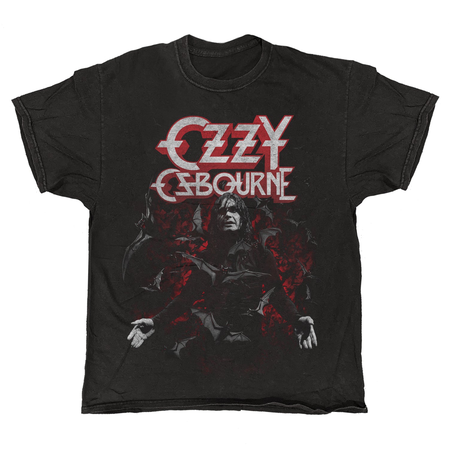 This Ozzy Osbourne shirt features a vintage wash with an artwork of Ozzy surrounded by bats.