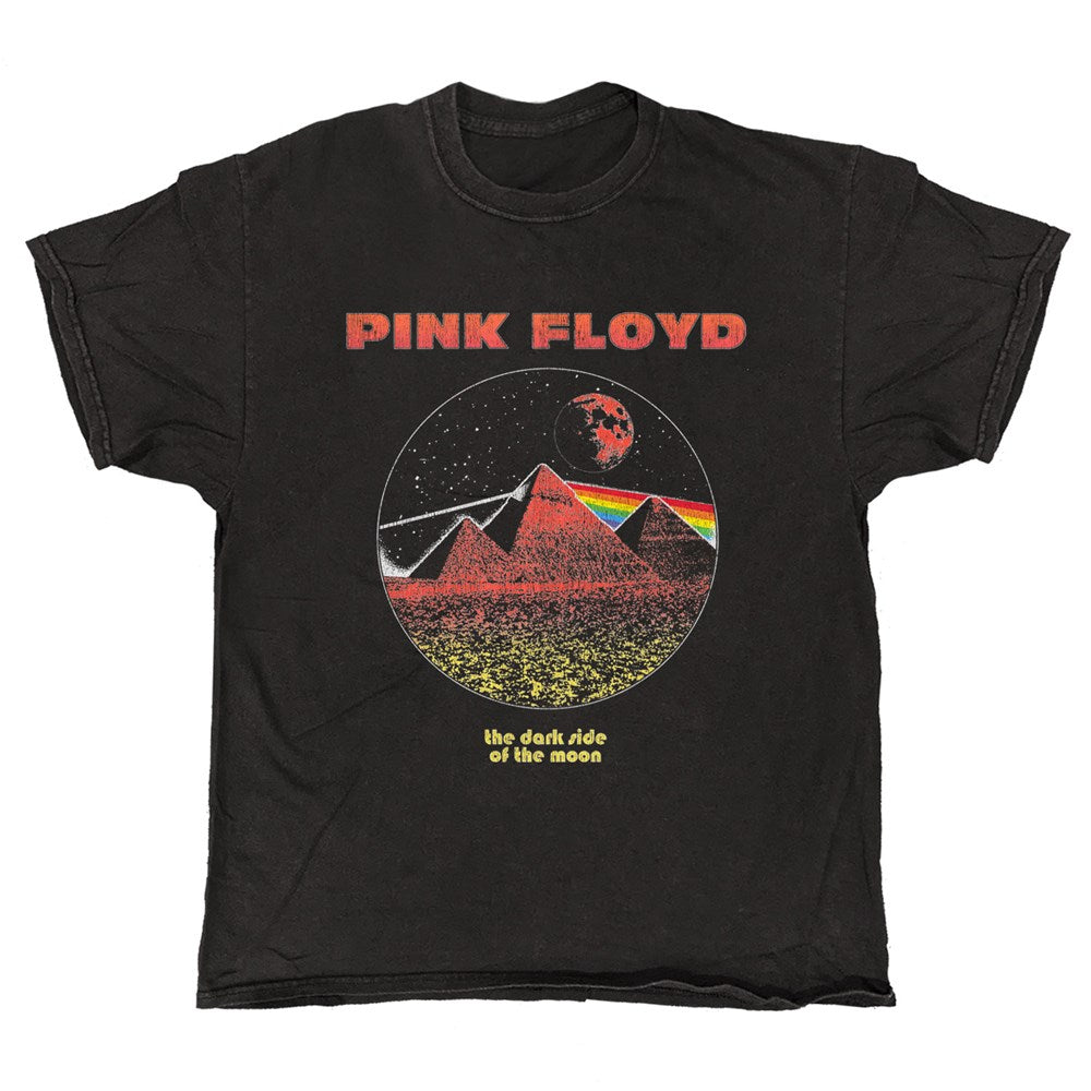 Step into the shadows of rock history with this Pink Floyd Dark Side Pyramids black vintage tee. Featuring faded prism-meets-pyramid artwork and a perfectly worn look, it’s equal parts cosmic and classic. Soft cotton. Timeless fit. Made for fans who know the dark side isn’t just a phase.
