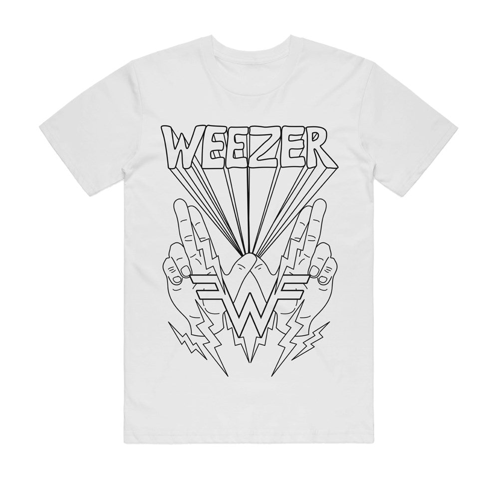 This Weezer t-shirt features their icon flying W design and the W hand gesture